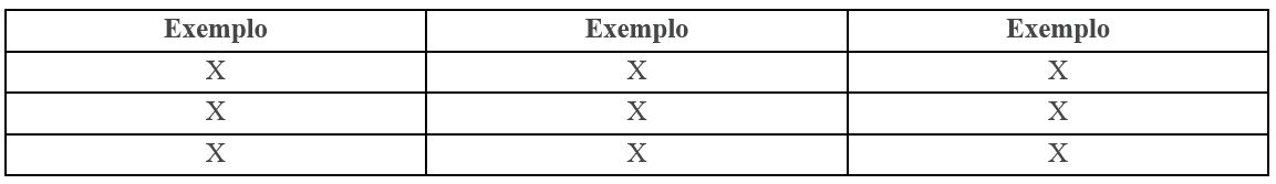 Os Quadros devem ser enumerados por ordem de aparição no texto (Quadro 1, Quadro 2, Quadro 3 etc.). Os Quadros devem estar formatados da seguinte forma: fonte do texto interno tamanho 10; título em negrito, tamanho 12, espaçamento simples e alinhado à esquerda; fonte em tamanho 11, espaçamento simples e alinhada à esquerda; espaçamento simples entre as linhas; AutoAjuste de Janela. Exemplo: